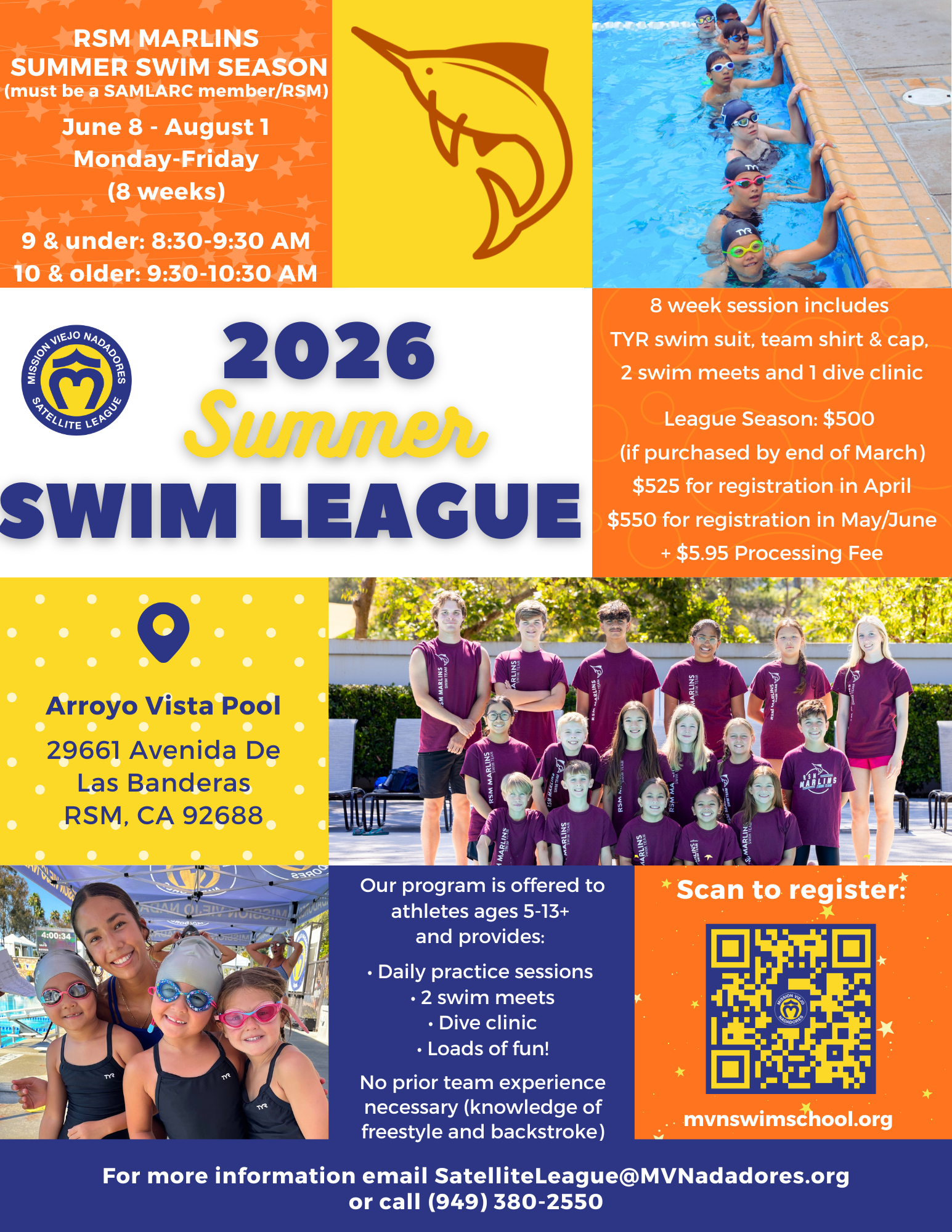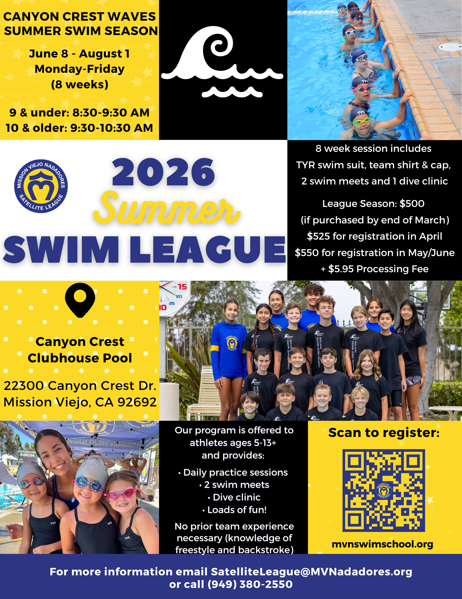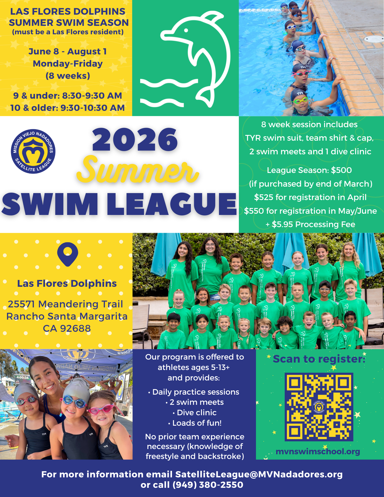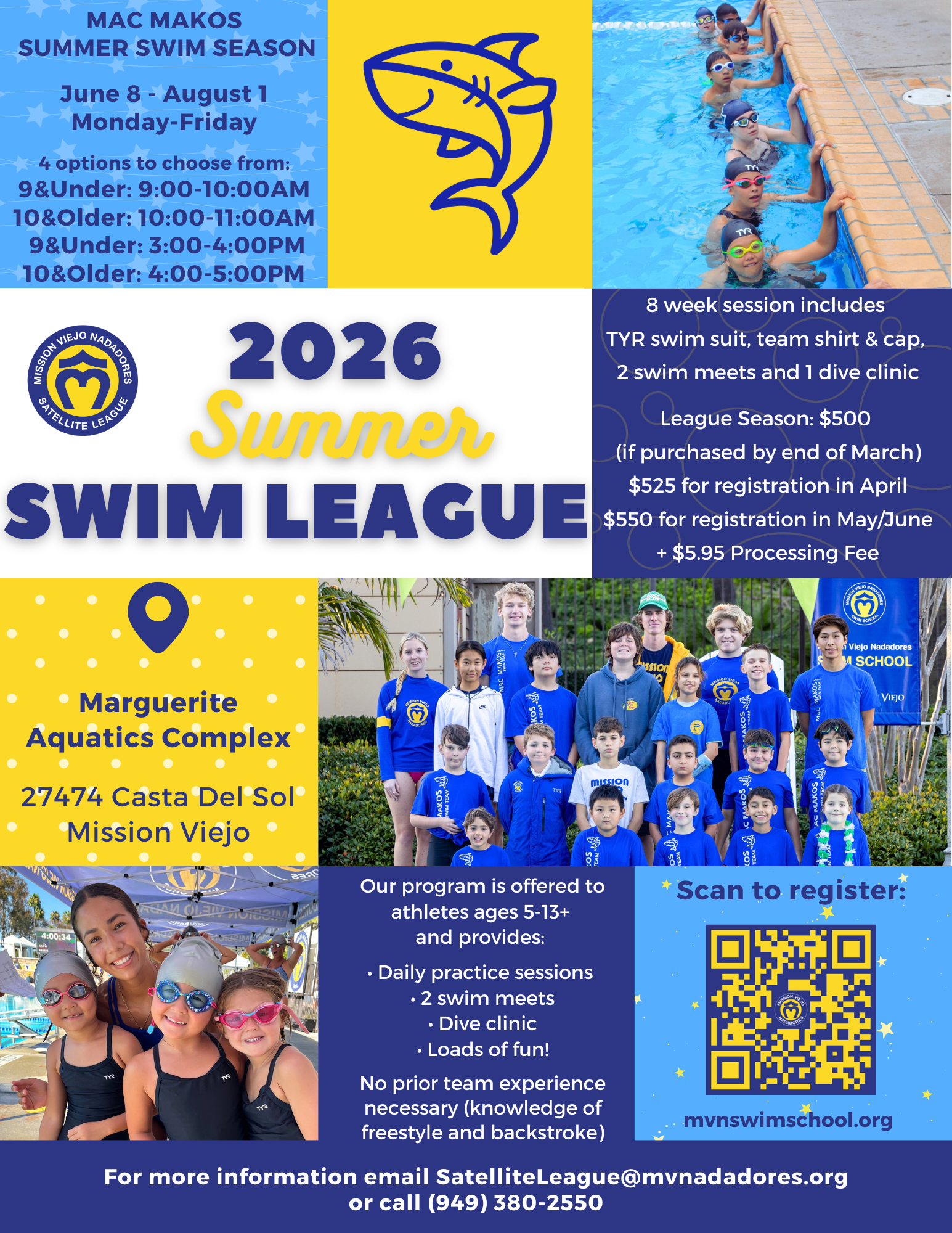 If your swimmer is currently enrolled in swim lessons with our Swim School, speak with your child's instructor about their readiness for the program. If your swimmer is not currently enrolled in Swim School and would like to join the MVN Satellite teams, and has NOT swum in the program in previous years, they WILL require a tryout. Please notate in the registration process that your swimmer requires a tryout. If you have any questions regarding tryouts, please call our office at 949-380-2550 or email swimschool@mvnadadores.org.